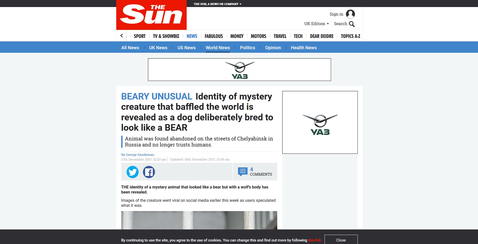 Фотографии необычной собаки, больше похожей на медведя, разошлись в социальных сетях. Люди из разных стран гадают, кто же перед ними: настоящий медведь или «замаскированный» пес. Заинтересовались «медвебакой» Потапычем и зарубежные СМИ. Например, британская газета «Metro» даже обратилась за консультацией к ветеринарам.