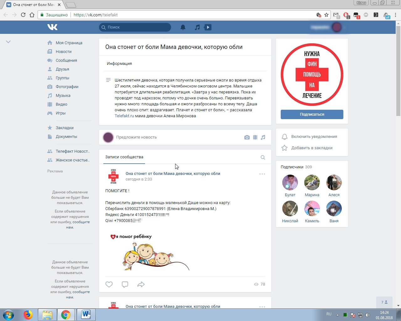 Злоумышленники решили прикрыться именем авторитетного СМИ и создали свою группу в «ВКонтакте». В сообщество вступило больше 300 человек. Сколько людей решилось перечислить средства в помощь пострадавшей девочке — неизвестно. Редактор Telefakt.ru сообщает, что сайт не имеет отношения к лже-благотворительности.