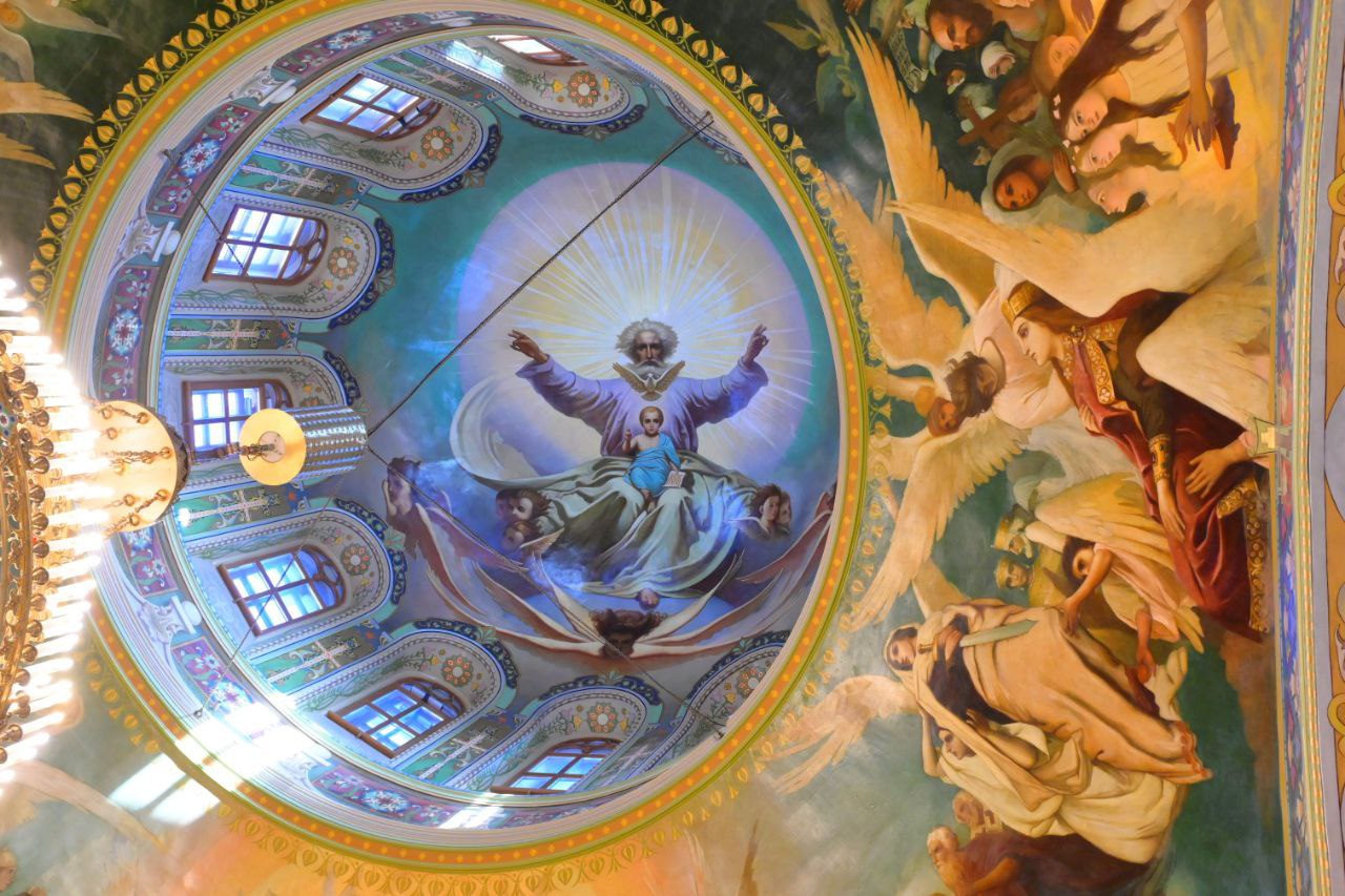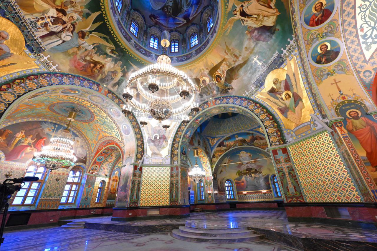 До революции храм успели расписать только в верхней части. Сейчас удалось восстановить первоначальные замыслы архитекторов и иконописцев. Губернатору показали восстановленную фреску Иисуса Христа в алтаре, изображение Святой Троицы в центральном куполе, евангельские сюжеты, лики святых угодников Божиих, ангелов и многое другое.