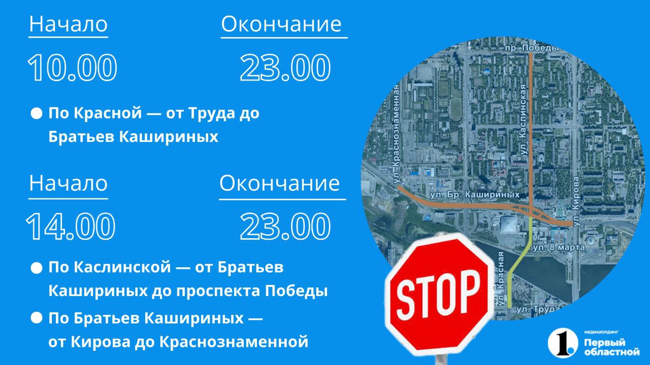 На время праздничных мероприятий, с 10 до 23 часов, перекроют участок улицы Красной от Труда до Братьев Кашириных. А с 14 до 23 часов будет закрыто движение еще на двух дорогах: по Каслинской — от Братьев Кашириных до проспекта Победы, по Братьев Кашириных — от Кирова до Краснознаменной.