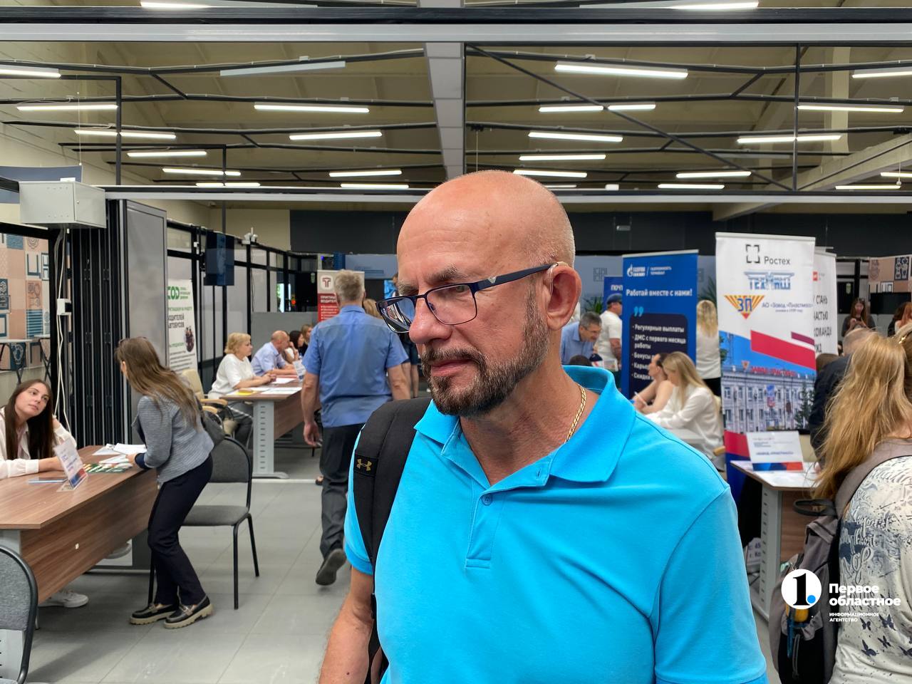 Челябинец Владимир Ковязин ищет работу, связанную с электрикой или станками. Он отправился к стенду ЧТЗ.