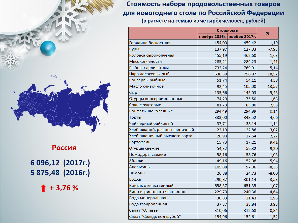 Стоимость набора продовольственных товаров в 2017 году выросла на 3,8%. В прошлом году аналогичный набор приобретали за 5875 рублей. Самая высокая цена продуктов в Чукотском автономном округе — 8178 рублей. Меньше всего заплатят в Ингушетии — 3153 рубля. В Челябинской области цена средняя. За полный набор продуктов жители региона заплатят 5832 рубля. Цена выросла на 5%. — рассказывали сайту «Первый областной» в