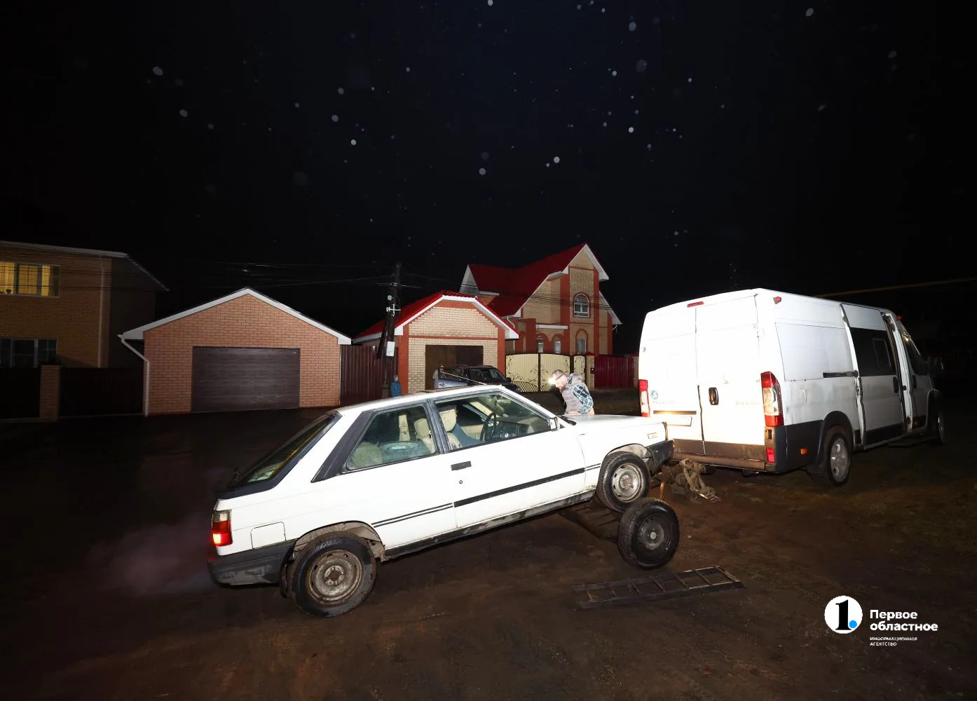 Мужчины везут два автомобиля, чтобы сэкономить на топливе, один из них на сцепке.