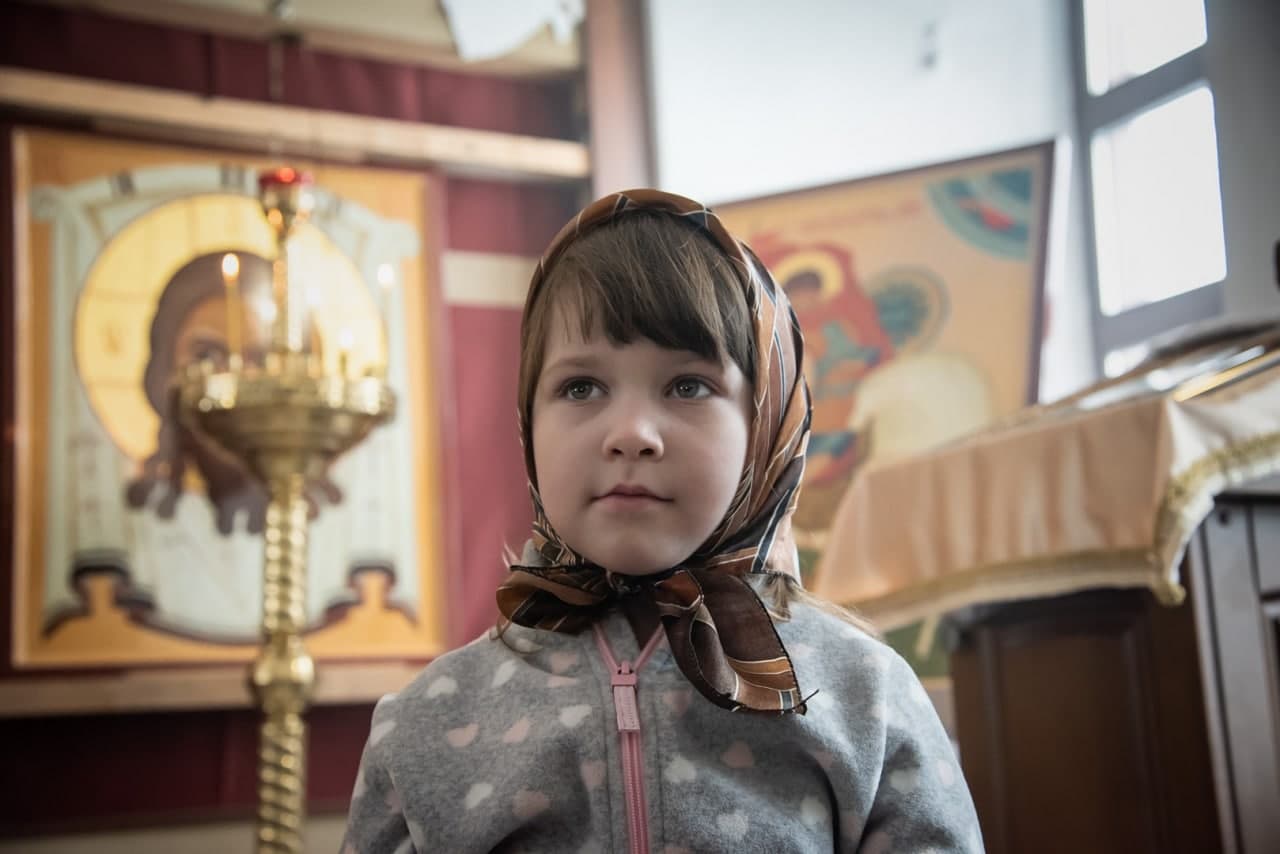 На службе много маленьких деток. На удивление они послушные. Одни стоят, а другие сидят у родителей на руках. Однако хода божественной литургии дети не нарушают — не капризничают, ни кричат. Видно, что визит в церковь для них — привычное дело.