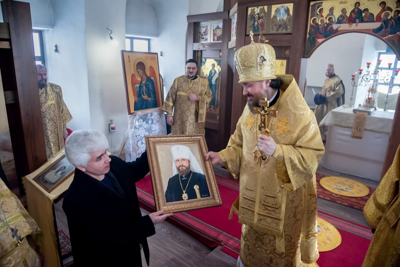 От лица прихожан после службы Михаил дарит митрополиту портрет владыки, нарисованный маслом художником из Челябинска Валерием Мокшиным.