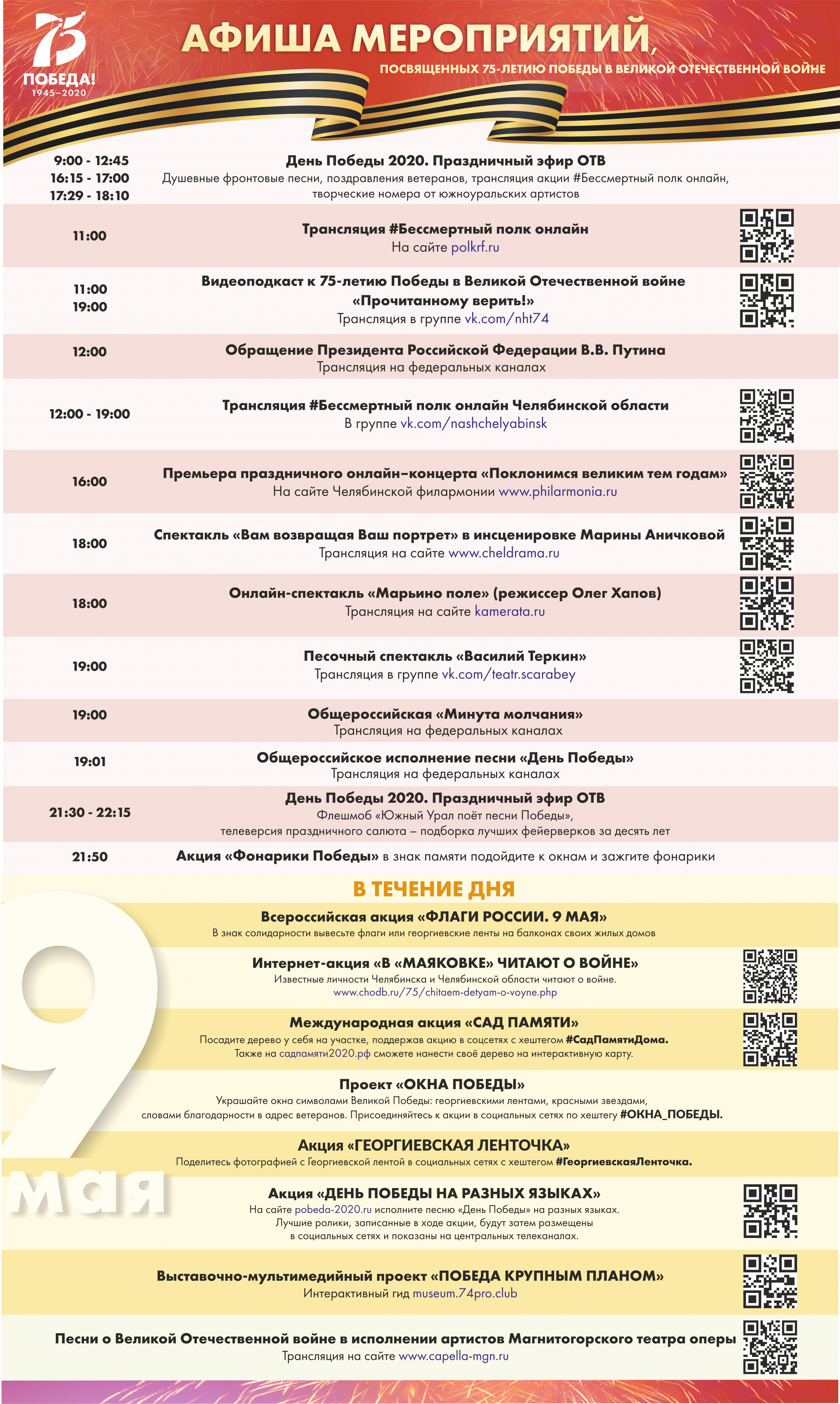 Стал известен список мероприятий, который состоится 9 мая. В афише, подготовленной к 75-летию Великой Победы, все мероприятия направлены на то, чтобы южноуральцы оставались дома.