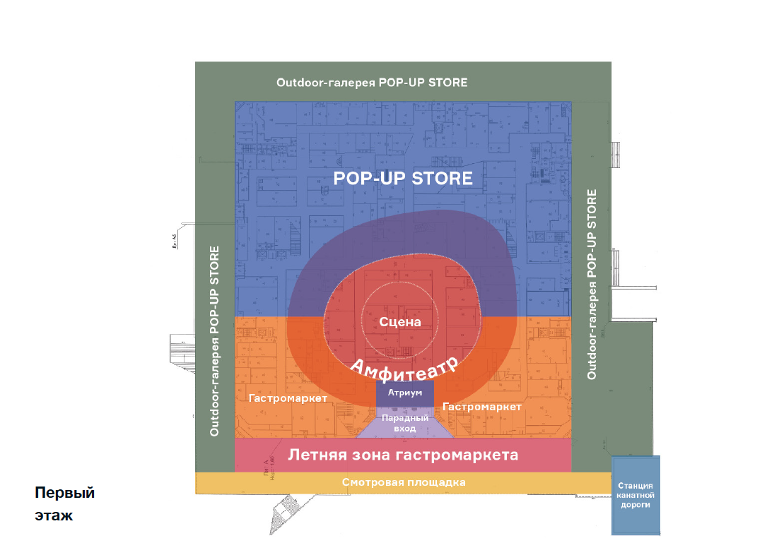 Так, в просторном и воздушном Торговом центре можно было бы разместить роскошный ботанический сад (здесь как раз достаточный объем воздуха для создания естественной тепловой инерции), галерею современного искусства, гастромаркет, гостиницу, площадку для проведения фестивалей, творческий коворкинг и точки pop-up store. Смысл концепции в том, что в разное время суток здесь можно торжественно принимать гостей города, устраивать праздники и крупные выставки или просто гулять по ботаническому саду или отдыхать на пляже у реки. А по вечерам уникальный купол здания можно использовать как экран для лазерного шоу. При этом для разных сценариев развлечений подходит одна и та же инфраструктура.