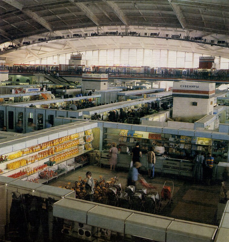 Гигантский летящий купол без единой колонны-опоры, несколько тысяч квадратных метров, десятки отделов с дефицитными товарами. «Если вы потерялись, встречайтесь в центре зала у фонтана», — вещал приятный женский голос из репродуктора. Ежедневно магазин посещали до 150 тысяч покупателей, которые оставляли в кассах до полумиллиона рублей. По советскому-то курсу!