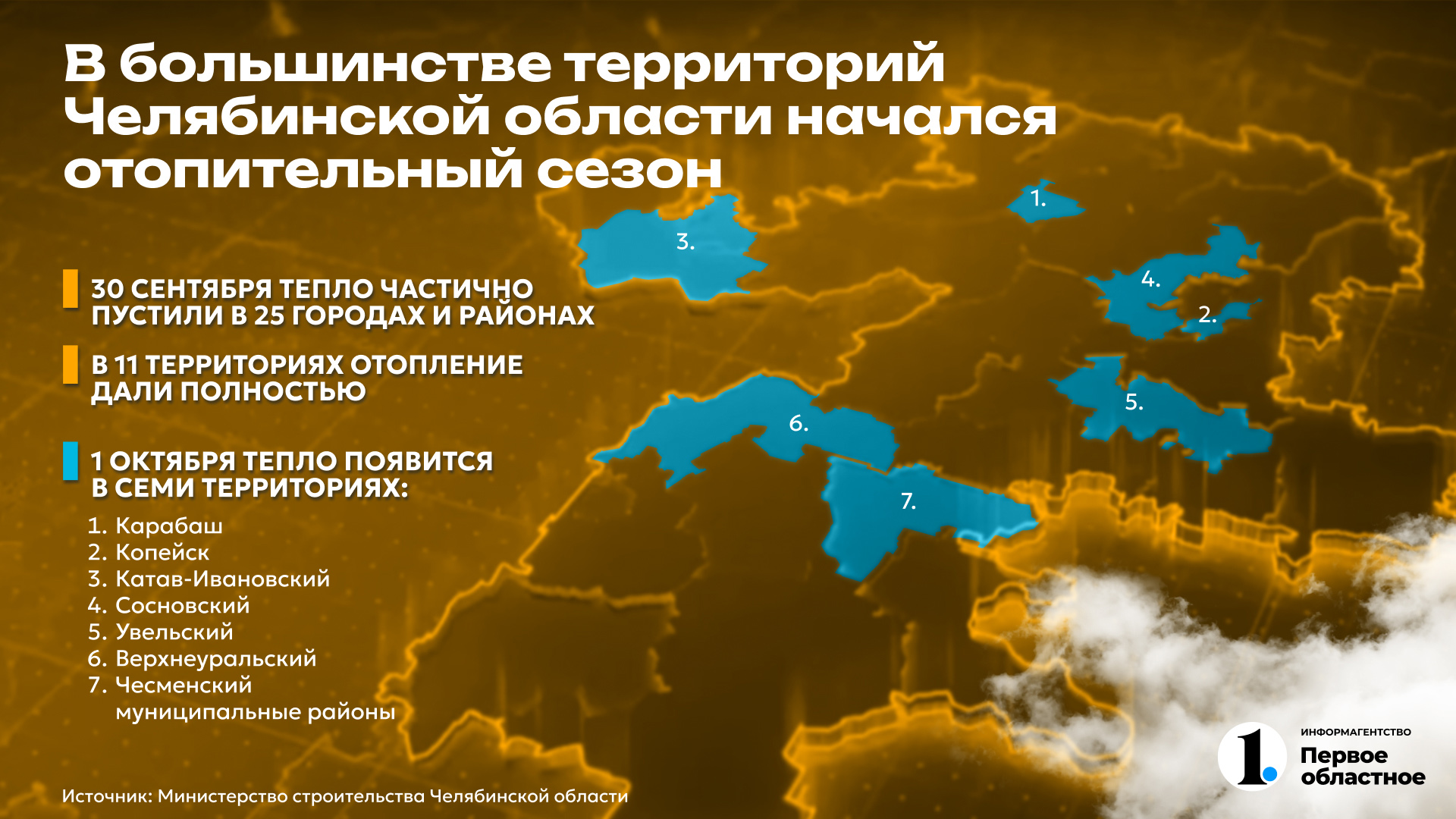 На 30 сентября известно, что частично запустили отопительный сезон в 25 муниципалитетах: Верхнем Уфалее, Златоусте, Кыштыме, Локомотивном, Магнитогорске, Миассе, Озерске, Троицке, Чебаркуле, Челябинске. А также в Агаповском, Аргаяшском, Ашинском, Варненском, Еманжелинском, Еткульском, Карталинском, Каслинском, Коркинском, Кунашакском, Нагайбакском, Троицком, Уйском, Чебаркульском муниципальных районах.