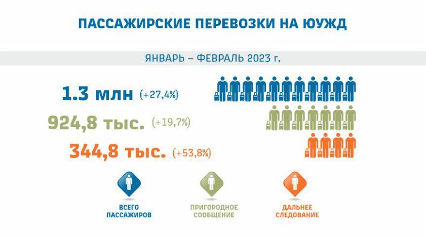 За два месяца 2023 года по Южно-Уральской железной дороге проехало 1,3 млн пассажиров (+27,4% к январю-февралю 2022 года). В дальнем следовании со станций отправились 344,8 тыс. пассажиров (+53,8%), а в пригородном сообщении — 924,8 тыс. пассажиров (+19,7%).