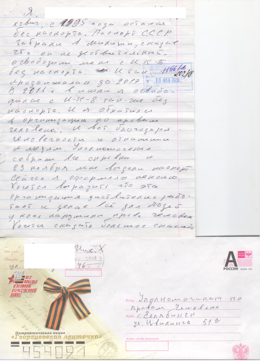 Уполномоченный по правам человека Челябинской области Маргарита Павлова получила письмо с просьбой о помощи. В нем мужчина рассказал, что живет больше 20 лет без паспорта. Документ советского образца у него забрали в 1995 году, и так и не вернули.