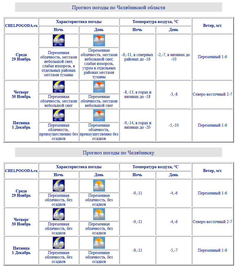 В пятницу, 1 декабря, ожидается переменная облачность, преимущественно без осадков. Температура воздуха ночью опустится до минус 9–14 градусов, в горах и низинах до минус 20 градусов. Температура воздуха днем будет составлять от минус 5 до минус 10 градусов. Ветер переменных направлений 1–6 метров в секунду. — сообщили сайту «Первый областной» в челябинском Гидрометцентре.