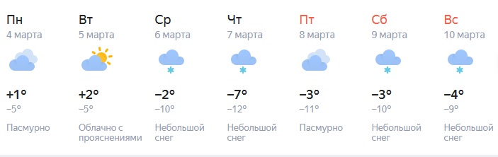«Тепло, наступившее в последней пятидневке февраля, с дневной оттепелью до небольших плюсовых значений, простоит до конца первой пятидневки марта. 5—7 марта опустится арктический фронт, который принесет снег, в основном небольшой. Наступит более холодный период при температуре воздуха, близкой к норме: ночью −12...−18°С, днем — от −1 до −5°С»,— рассказала синоптик.