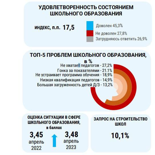 Запрос на строительство школ в регионе невысок. О такой необходимости заявили 10% опрошенных респондентов. К примеру, ответ «дороги» звучал в 5 раз чаще.