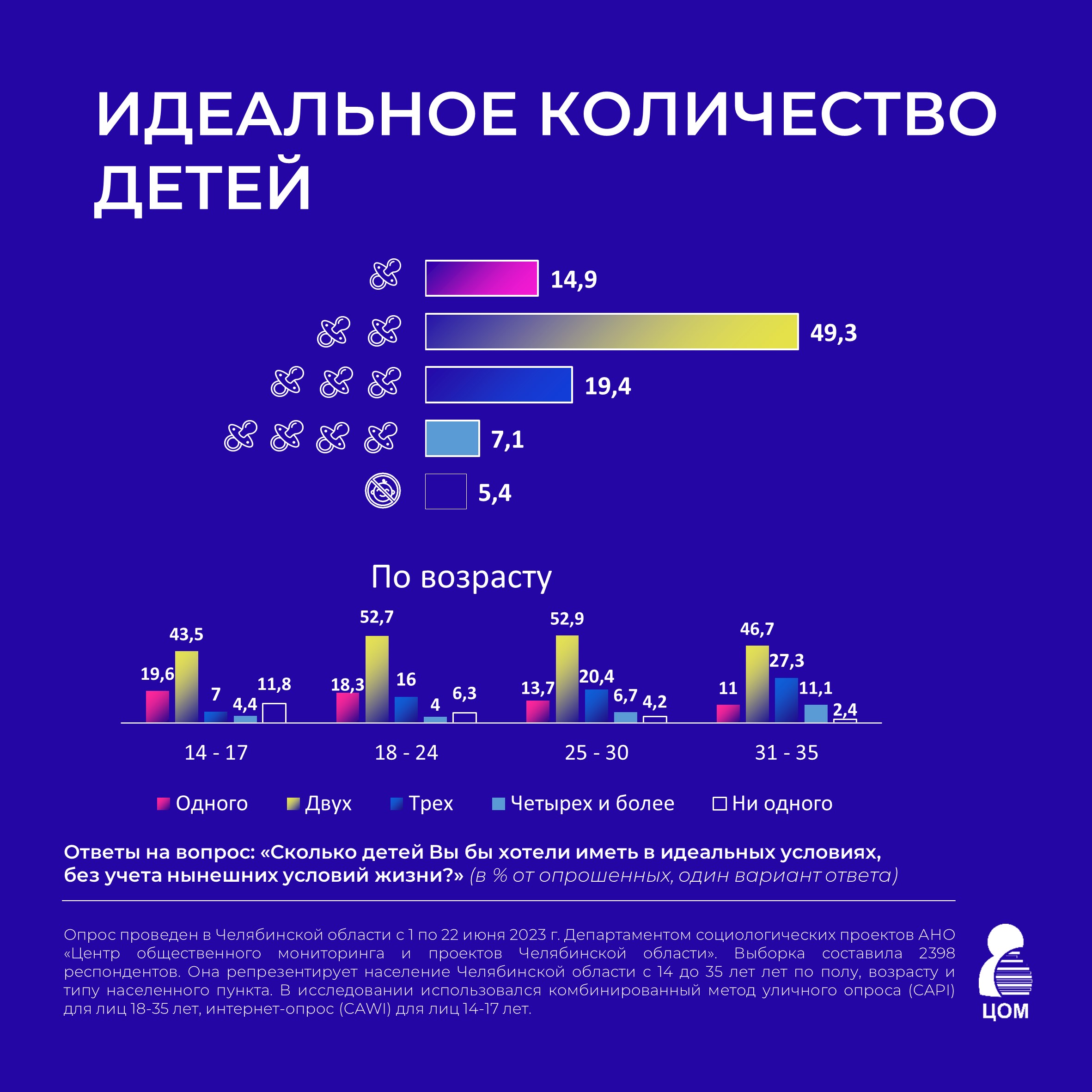 «Желание иметь троих детей характерно для жителей Челябинска и сельских районов, мужчин и женщин в возрасте от 31 до 35 лет, находящихся в настоящее время в отпуске по уходу за ребенком. Они чаще имеют высшее образование и в качестве желаемой сферы трудовой деятельности выбирают государственные структуры. Четырех и более детей чаще хотели бы иметь мужчины и женщины в возрасте от 31 до 35 лет, работающие молодые люди, сфера профессиональной деятельности которых — это искусство и культура либо бизнес и предпринимательство»,— рассказали исследователи.