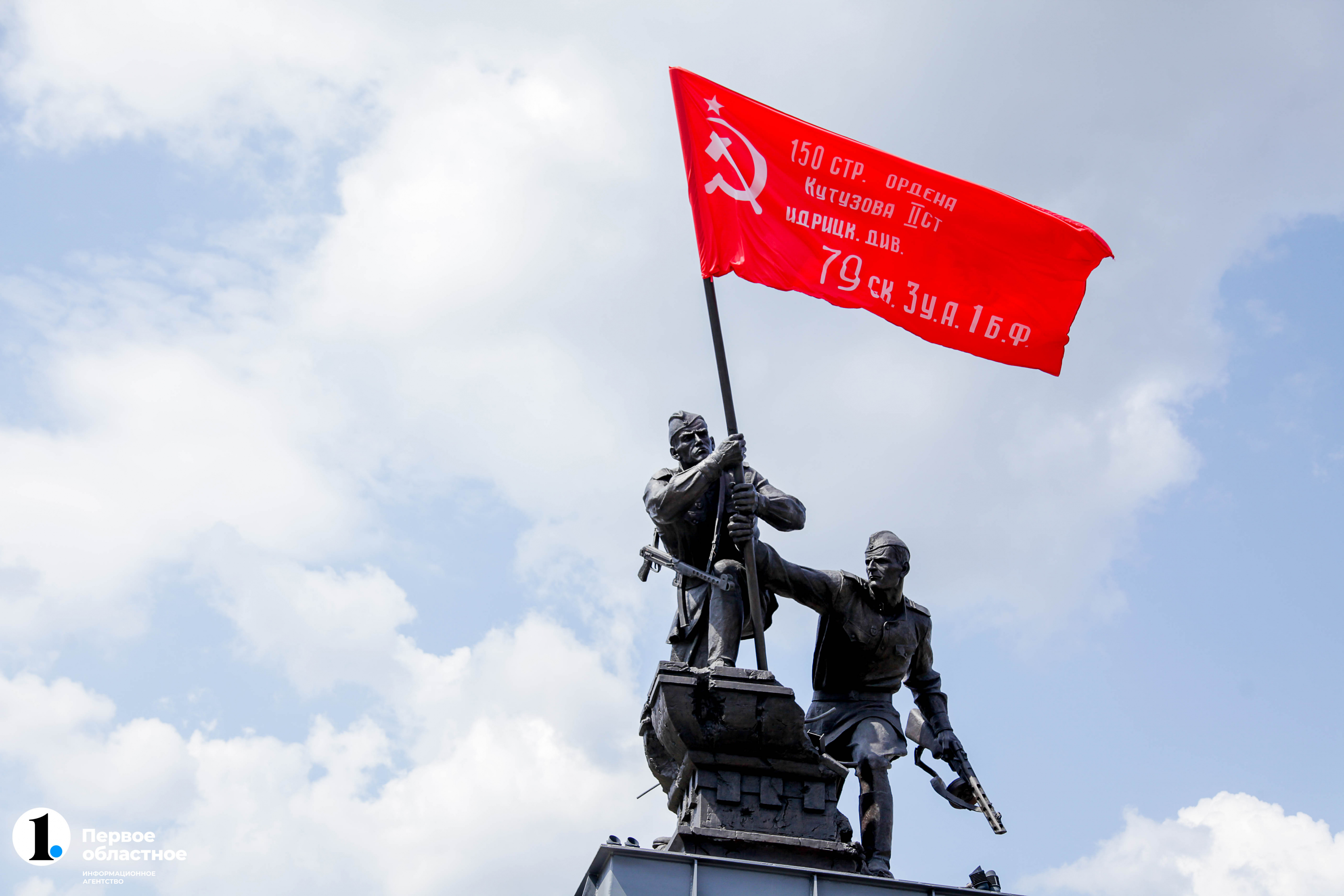 У входа в парк воссоздан купол Рейхстага с фигурами Егорова и Кантарии, которые одни из первых подняли над Берлином Знамя Победы. При установке этой скульптуры знамя в руках бойцов было бронзовым. А сейчас на флагштоке — красная ткань. Она полощется, хлопает на ветру, создавая иллюзию ожившей картинки.