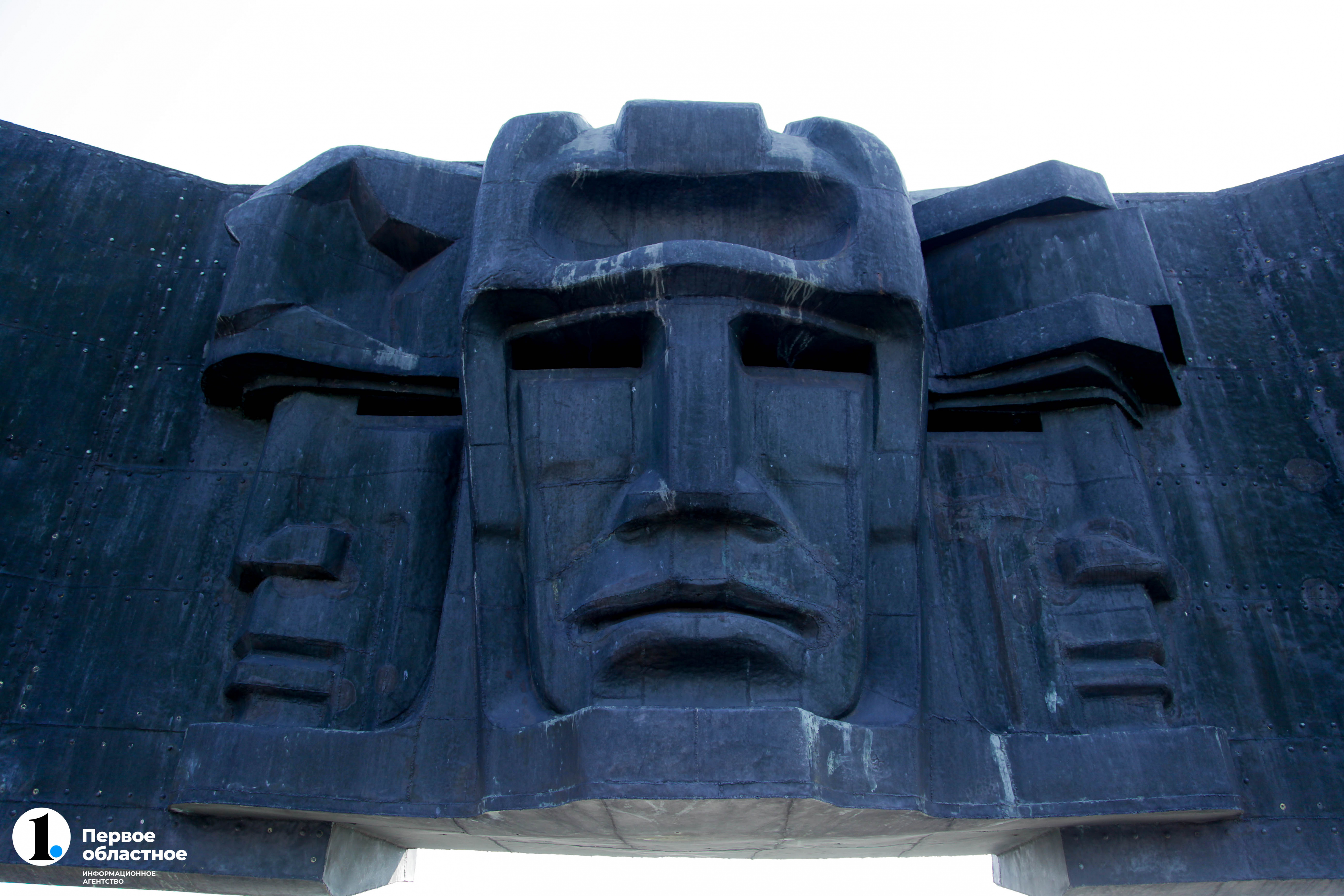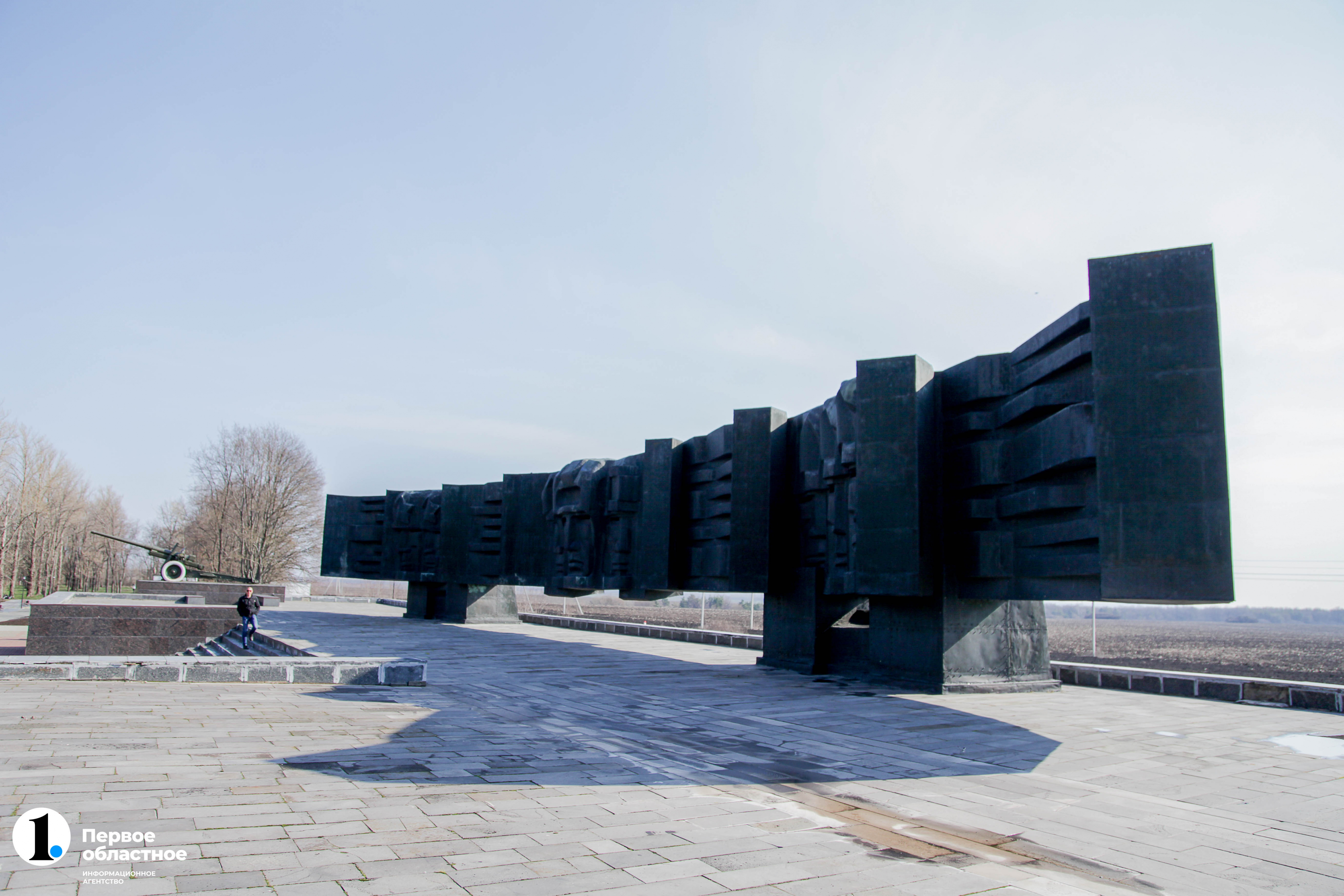 Огромный каменный барельеф с изображением лиц танкистов слегка приподнят над землей. Если встать на ступени, ведущие к барельефу, можно увидеть поле в таком же ракурсе, как его видели наши танкисты.