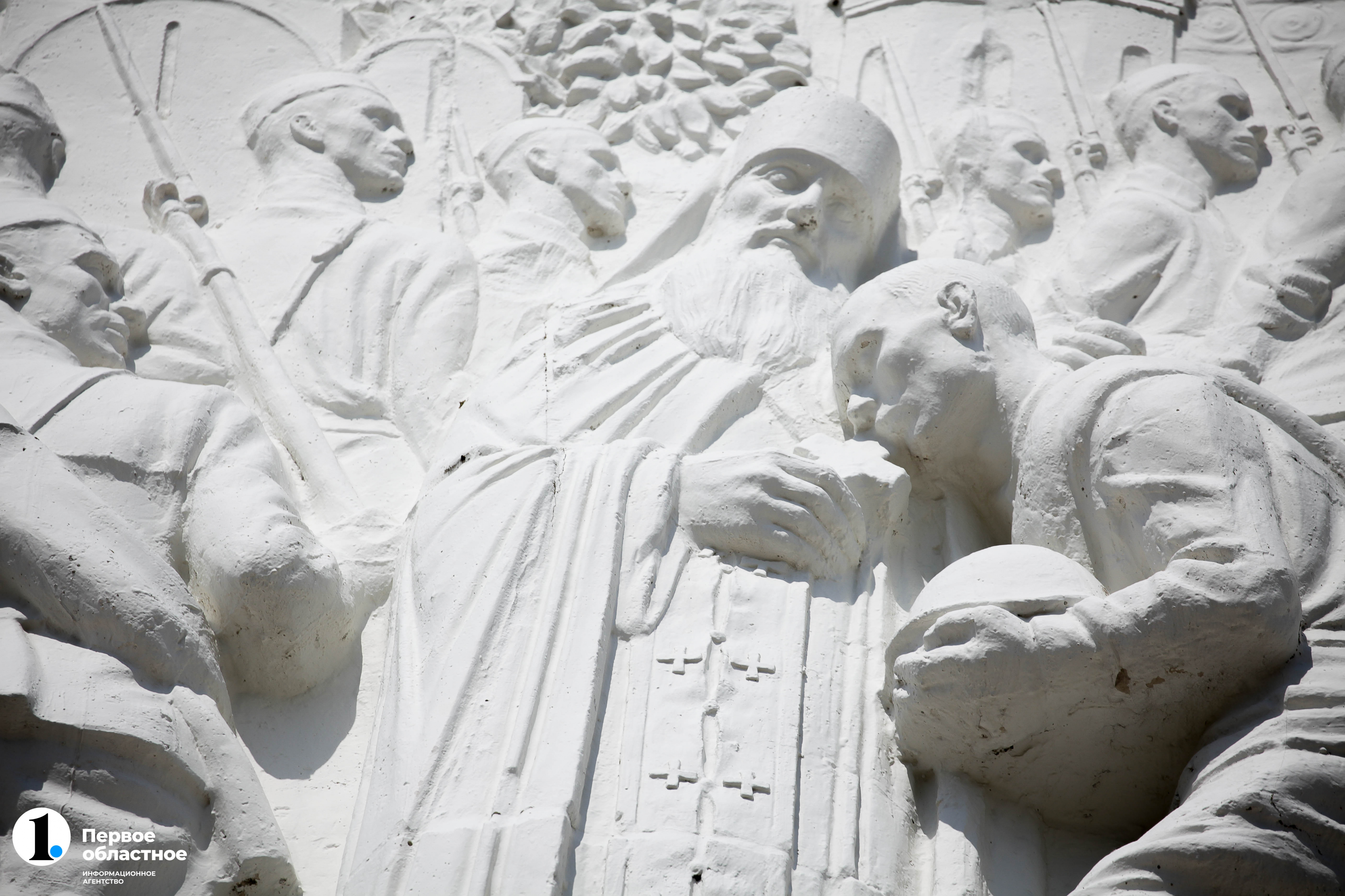 На самом поле, вдоль которого тянется федеральная трасса М-2 «Москва — Харьков», взметнулась ввысь, словно свечка, белоснежная Звонница. Ее четыре пилона рассказывают про четыре года войны. Сверху на барельефах — святые-защитники, ниже — герои реальной жизни: солдаты, мирное население и... корова. Говорят, что у этого образа был прототип — буренка, спасшая от голодной смерти мать с семью ребятишками на руках.