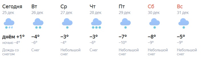 31 декабря, по предварительным данным, в Челябинске будет около −5 градусов днем. В новогоднюю ночь столбики термометров опустятся до −10 градусов. Ожидается слабый снег.