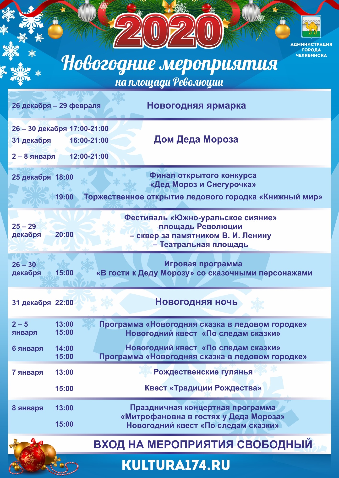 Стал известен список мероприятий, который подготовили для жителей Челябинска в Новый год — 2020. Масштабные гуляния начнутся еще 24 декабря, а закончатся, традиционно, только к концу зимних каникул.