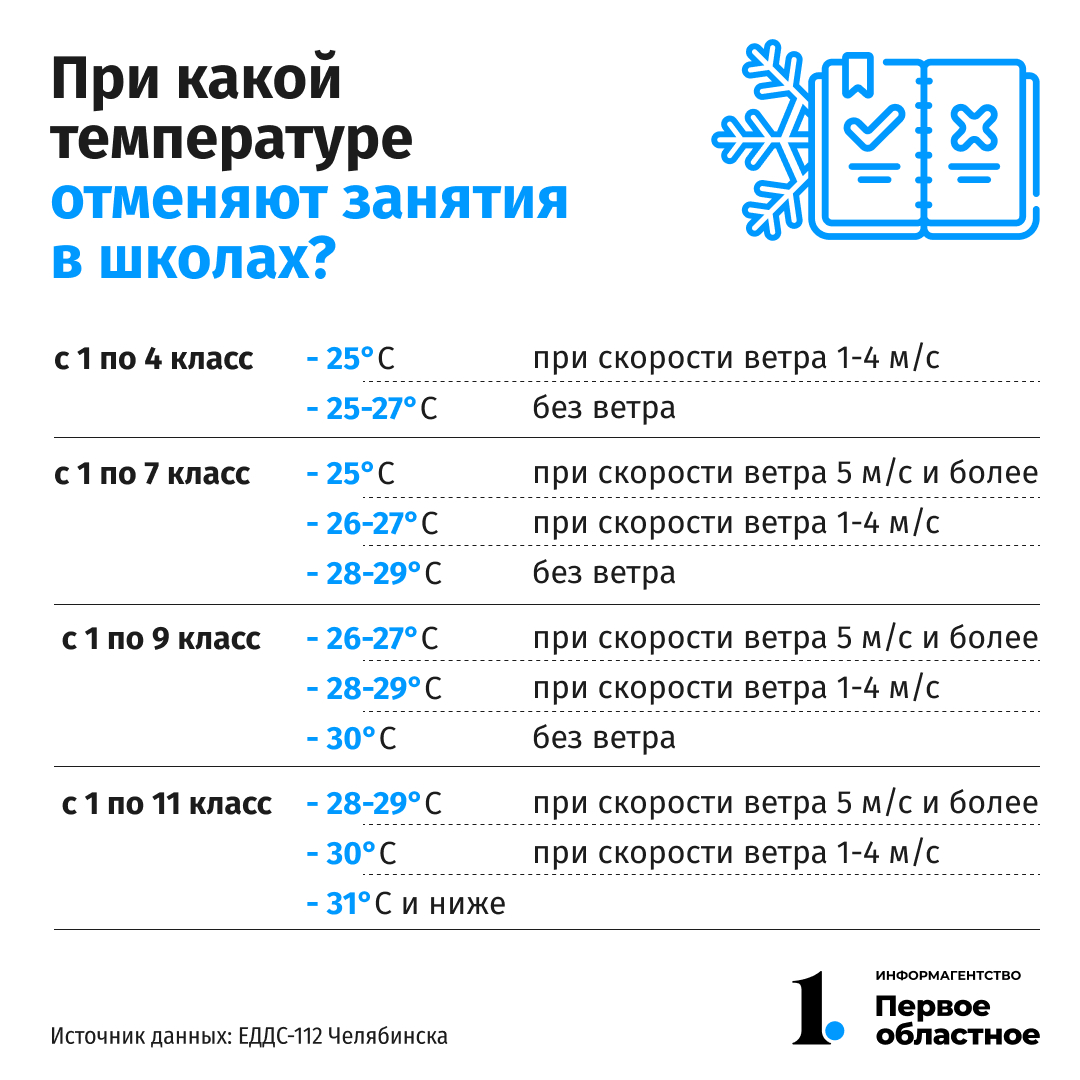 С 1-го по 4-й классы отправляют на дистант при температуре −25 градусов и ветре до 4 метров в секунду либо при температуре до −27 градусов при отсутствии ветра.