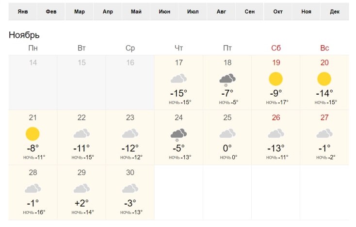 В субботу, 19 ноября, в ночные часы уже будет значительно теплее — −6…−11°C, днем −5…−10°C, на юге до 0 °C.