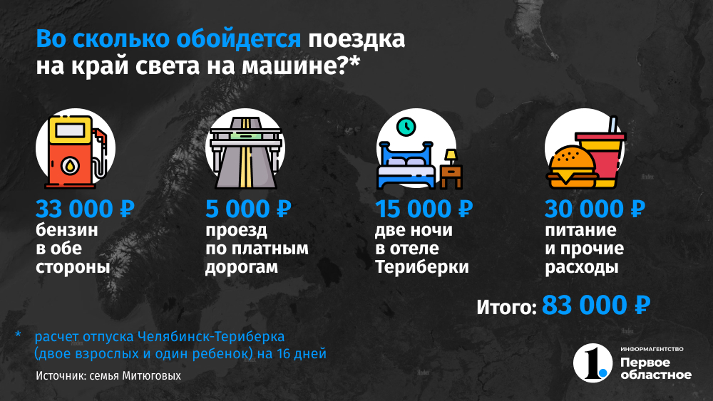 Всего путешествие Митюговых из Челябинска до Териберки заняло 16 дней, из них 11 прошли в дороге с живописными видами. По маршруту Челябинск — Казань — Ногинск — Олонец — Кандалакша — Териберка ребята добирались пять дней. Они проделали путь в 3 800 км.