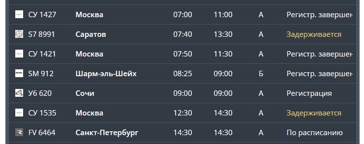 Согласно онлайн-табло на сайте аэропорта, рейсы, запланированные на 7 и 8 часов утра, перенесли на более позднее время.
