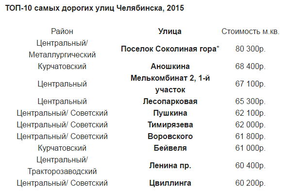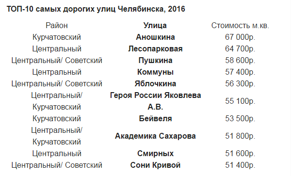 Топ-10 самых дорогих улиц был составлен в Челябинске. Большинство участников рейтинга находятся в Центральном районе, но возглавила список улица Аношкина из Курчатовского. Самыми доступными улицами оказались Взлетная и Строительная из Металлургического района.