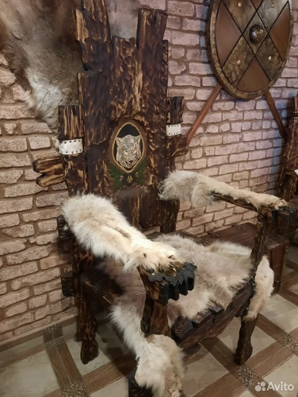 Еще один вариант необычной мебели — деревянный трон в историческом стиле. Такие предметы интерьера делают под заказ. Нарочито грубая фактура, меховые вставки и изображение дикого зверя — медведя или волка — на спинке кресла перенесут владельца в эпоху викингов.