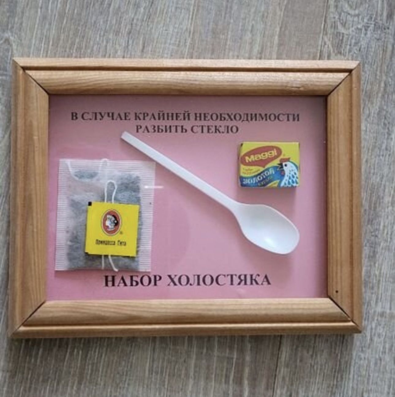 Ирина предлагает подарить свободным мужчинам «набор холостяка». Под стеклом собраны «жизненно важные товары»: ложка, чайный пакетик и кубик бульона. Достать все это следует в случае крайней необходимости. Правда, насколько этот набор поможет при той самой крайней необходимости, — продавец умалчивает.
