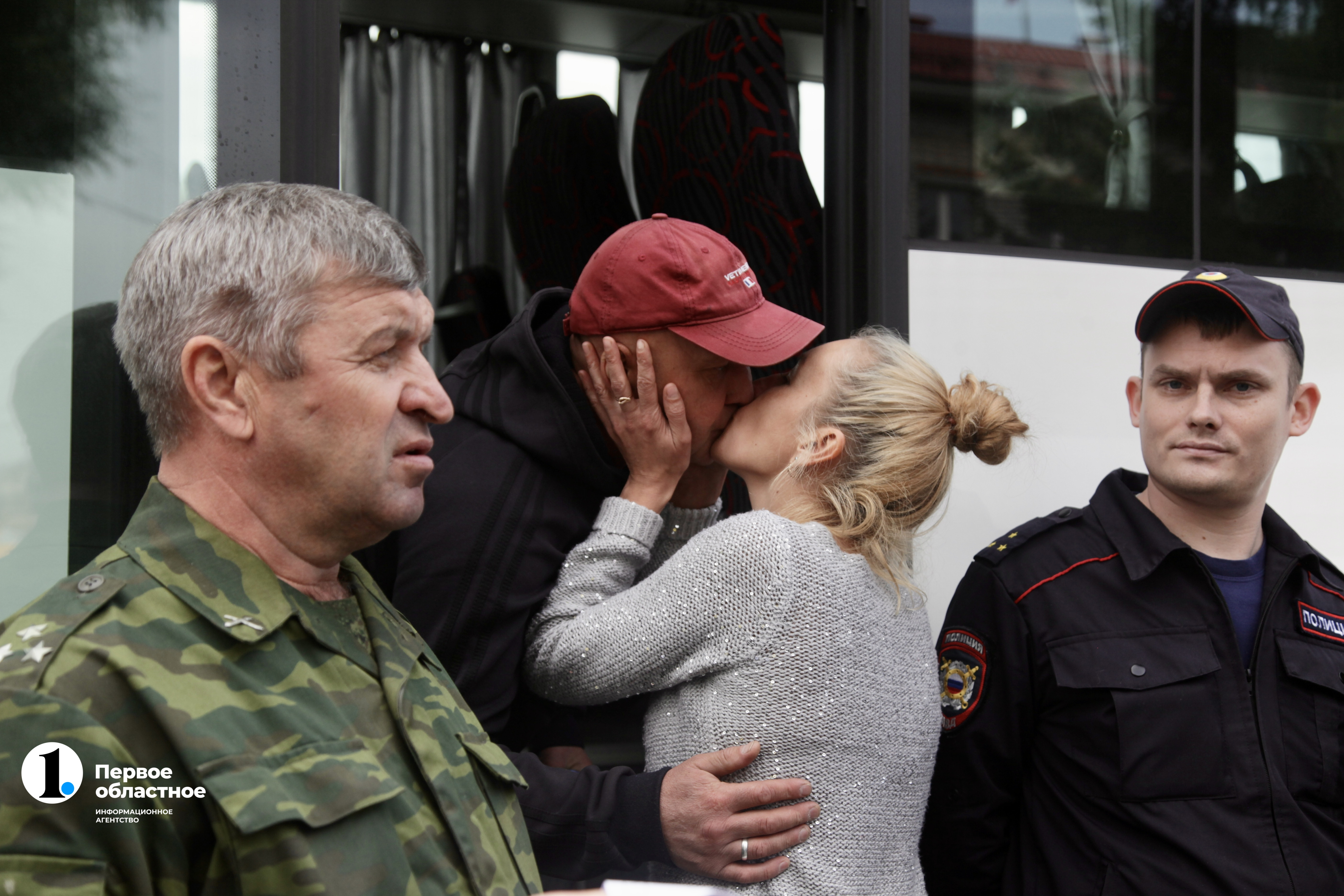 Одного за другим в здание военкомата вызывают танкистов. Потом все мобилизованные снова выходят, смешиваются с толпой. Снова — смех, слезы, разговоры. Наконец — команда на построение. За мобилизованными прибыл автобус.