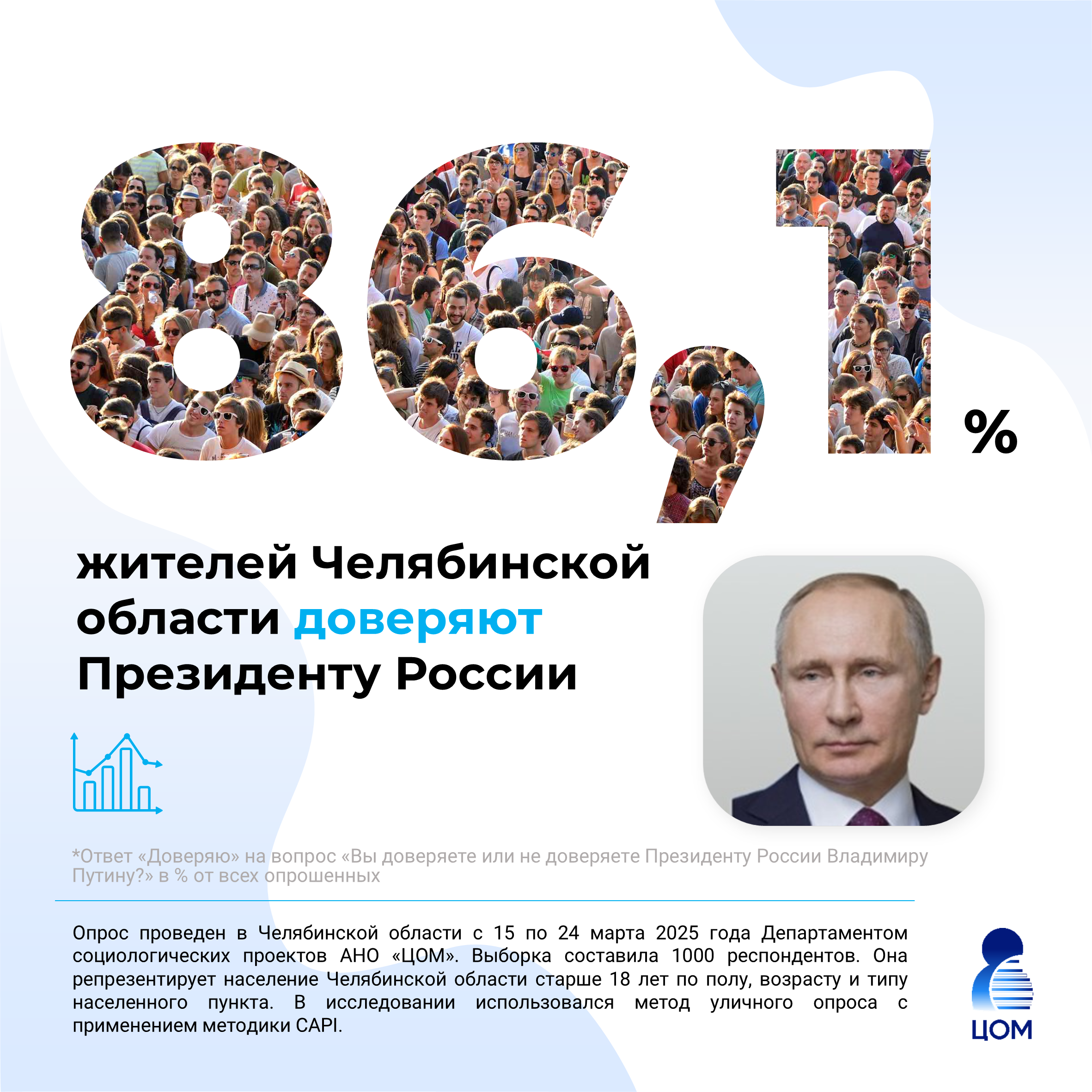Год спустя доверие к президенту лишь возросло. В период с 15 по 24 марта 2025 года специалисты ЦОМа спросили челябинцев, доверяют ли они Владимиру Путину. Положительно ответили 86,1% респондентов.