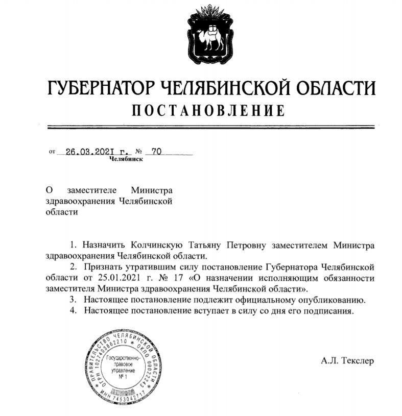 В понедельник, 29 марта, стало известно, что губернатор Алексей Текслер подписал постановление о назначении Татьяны Колчинской заместителем министра здравоохранения Челябинской области.
