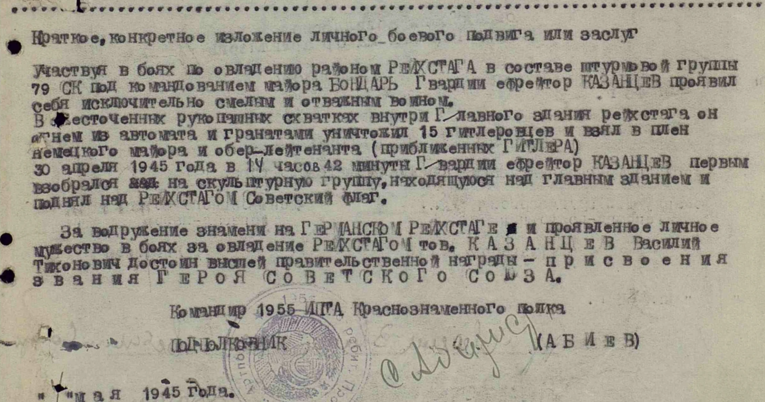 Бои за Рейхстаг шли больше суток. Немецкая артиллерия несколько раз сбивала советские флаги с крыши. Поэтому 1 мая решили установить символичное Знамя Победы, дело доверили Мелитону Кантарии и Михаилу Егорову. Акцию сняли военные корреспонденты. Подвиг Казанцев на кадры хроники не попал, ведь наш земляк устанавливал флаг в условиях боя.