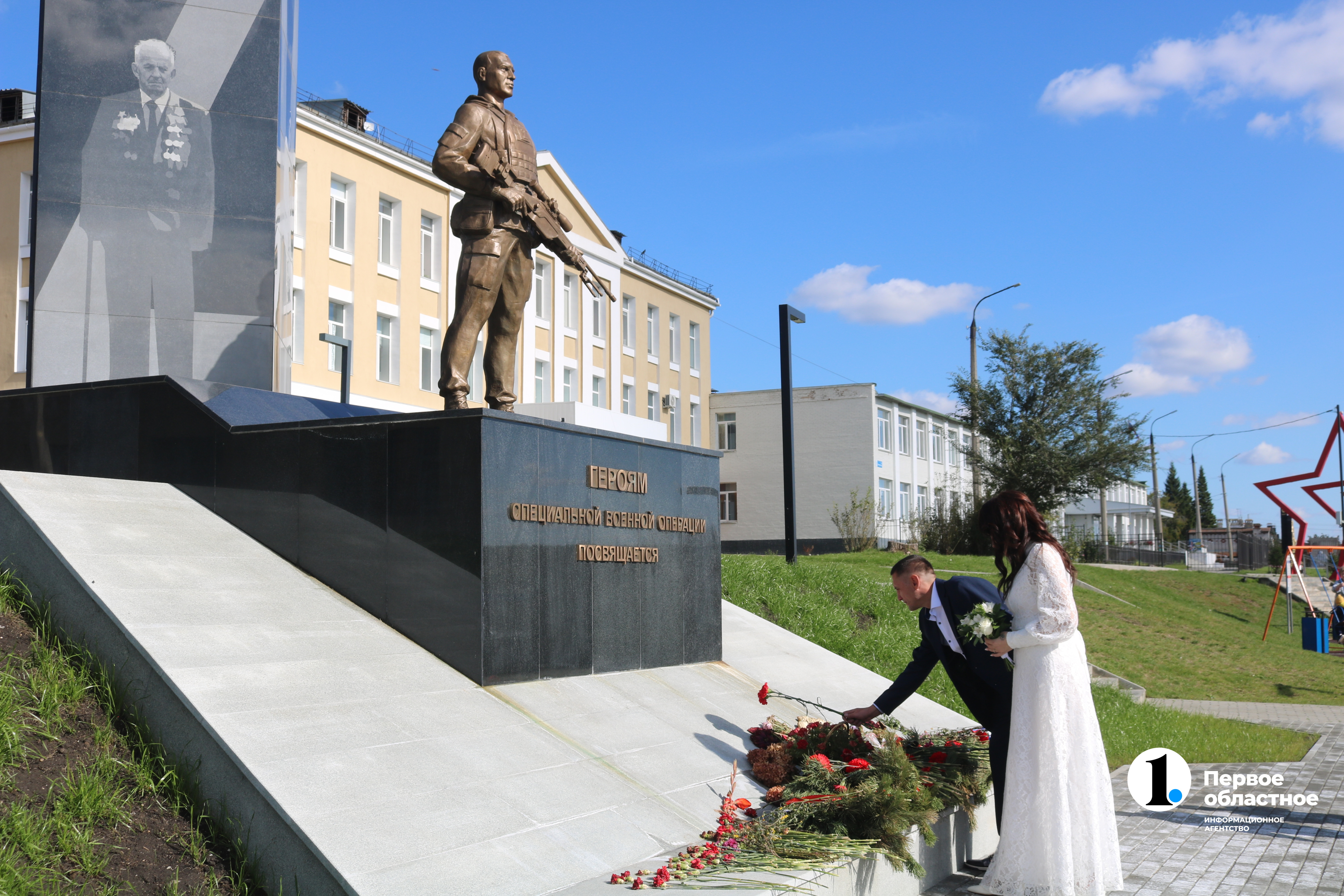 Молодожены съездили к новому памятнику участникам СВО на берегу реки Зюзелги. Там они почтили память сослуживцев Дениса и возложили цветы.