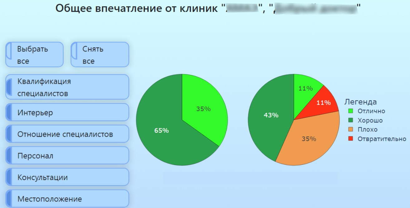 Сервис выдает результат в понятной инфографике. Можно изучить одну конкретную поликлинику или сравнить несколько сразу и выбрать лучшую. Причем данные — живые, система обновляет их в реальном времени.