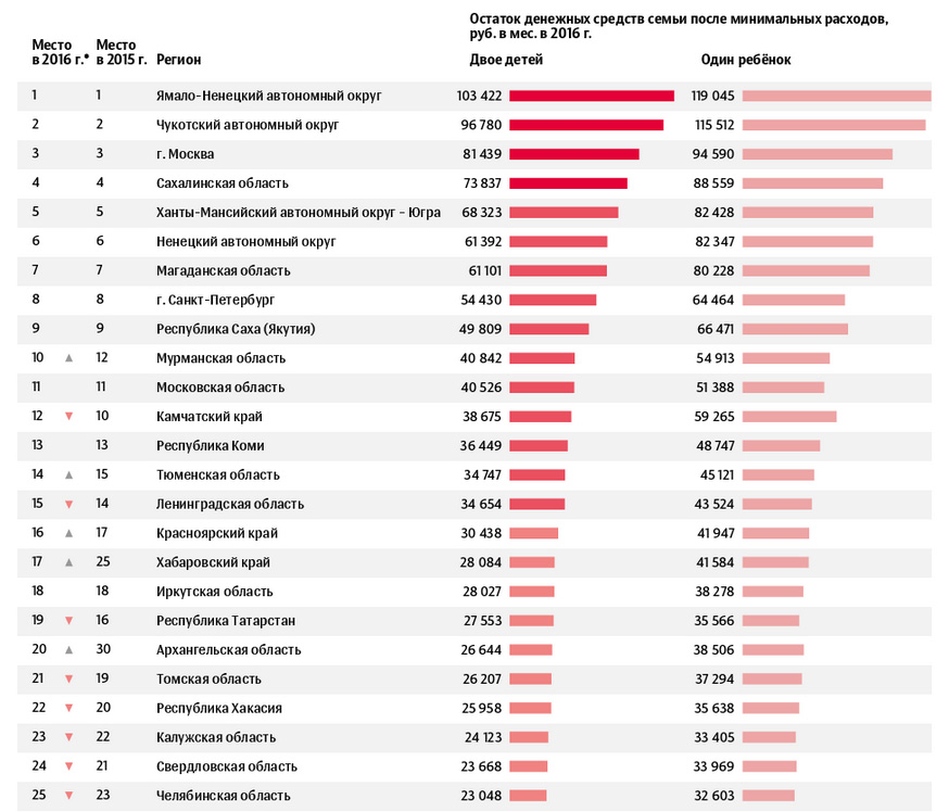 Эксперты рейтингового агентства «РИА Рейтинг» рассчитали уровень благосостояния семей с детьми и сравнили результаты всех регионов. Рейтинг составлялся на основании данных Росстата: специалисты подсчитали, сколько средств остается у работающей супружеской пары, имеющей одного или двух детей. Зарплата бралась средняя по региону, минимальные расходы соответствуют прожиточному минимуму.