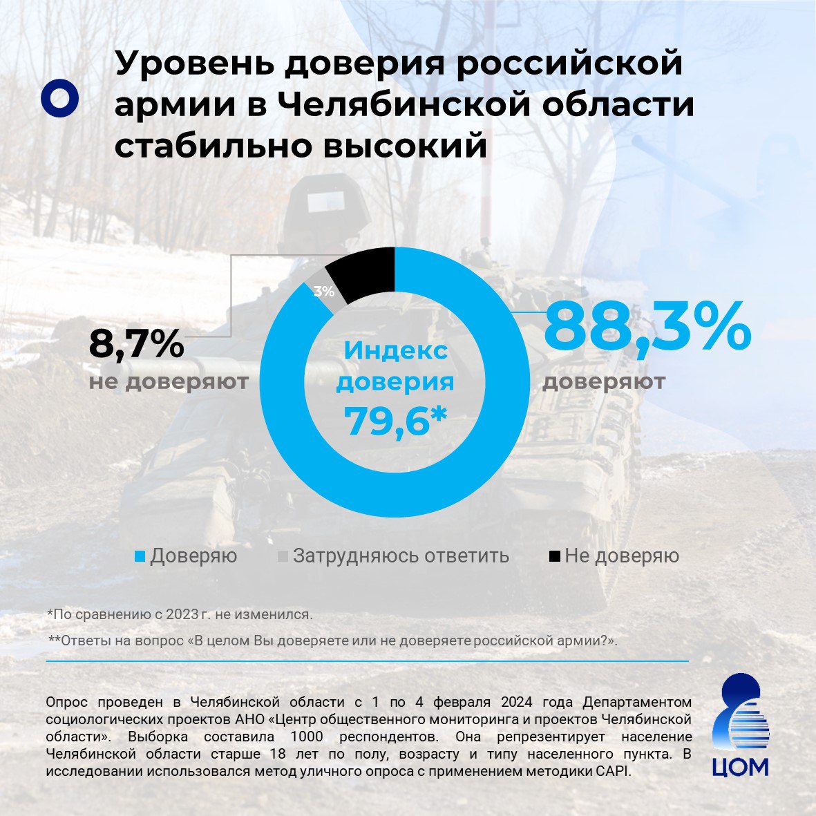 «По итогам опроса 88,3% южноуральцев доверяют Российской армии, 8,7% заявили об обратном. Индекс доверия Российской армии, таким образом, составил 79,6 процентного пункта», — говорят авторы исследования.