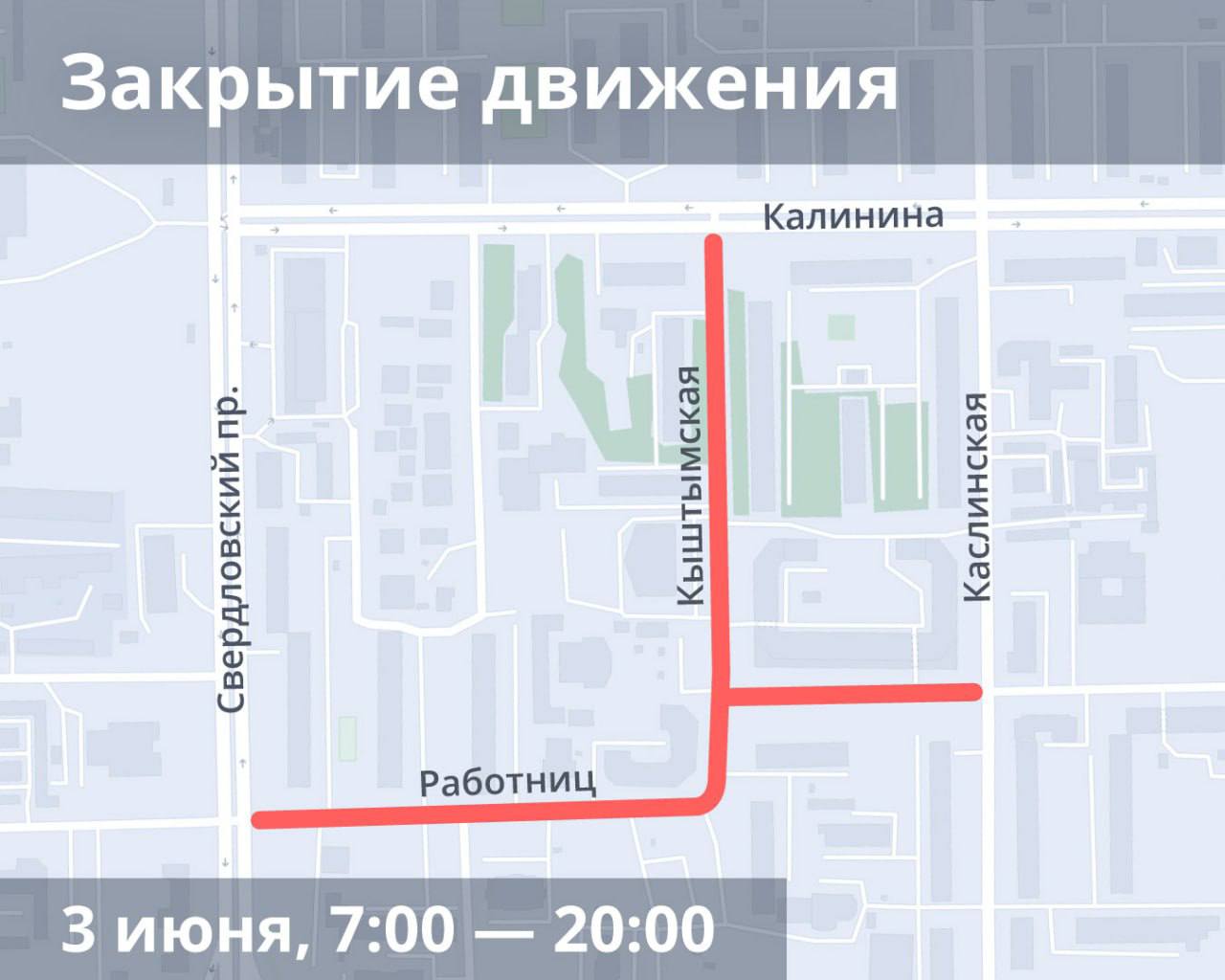 Движение для транспорта закроют на участке улицы Работниц от Свердловского проспекта до Каслинской. Также недоступным для автомобилей станет участок на Кыштымской от Калинина до Работниц. Время ограничения — с 7 часов утра до 8 часов вечера.