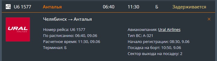 Сегодня, 9 июня, в аэропорту Челябинска рейс в турецкую Анталью задерживается на пять часов. Согласно онлайн-табло на сайте воздушной гавани, самолет должен был отправиться в 6:40, но вылетит только в 11:30, передает ИА «Первое областное».