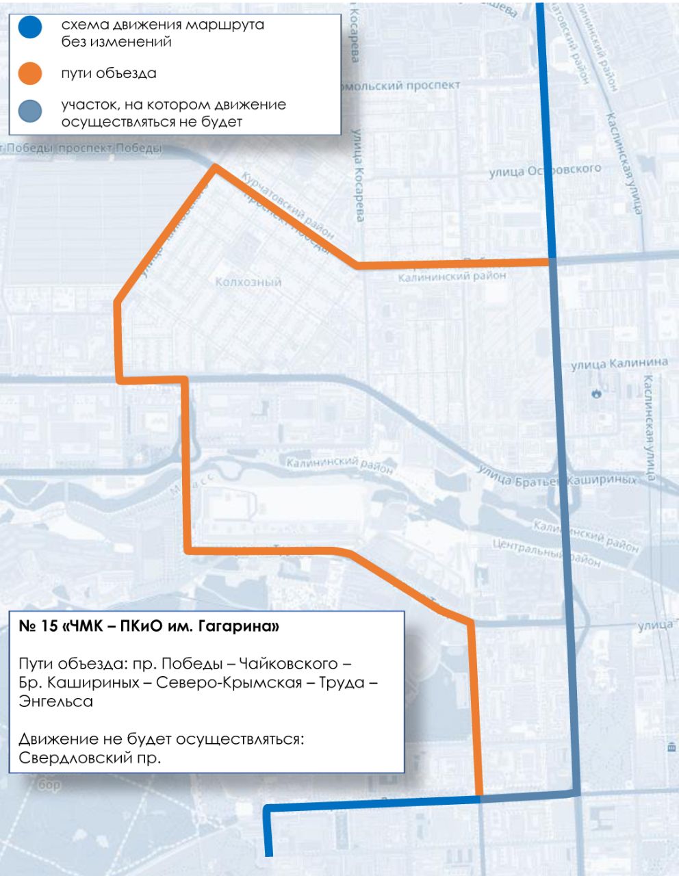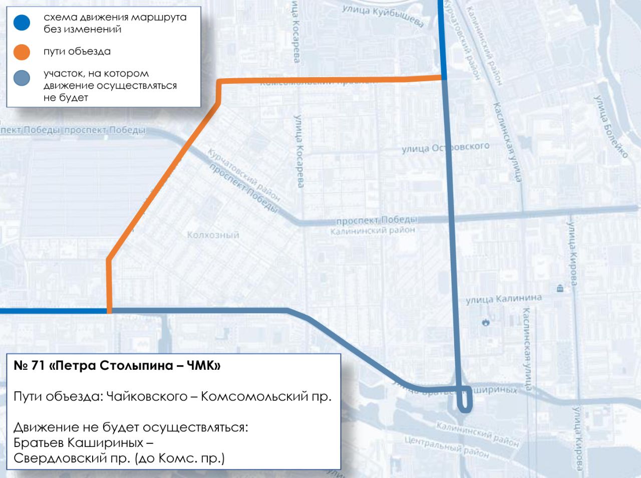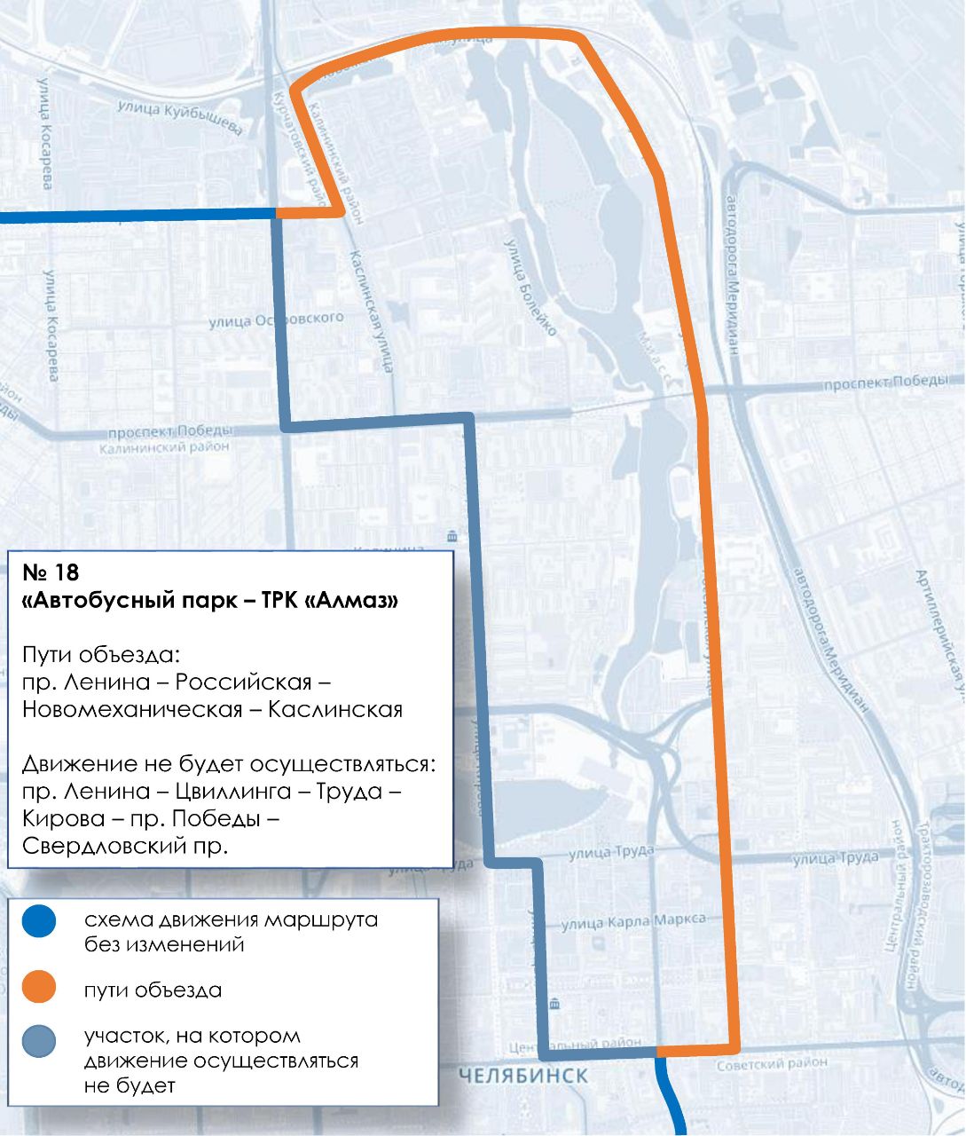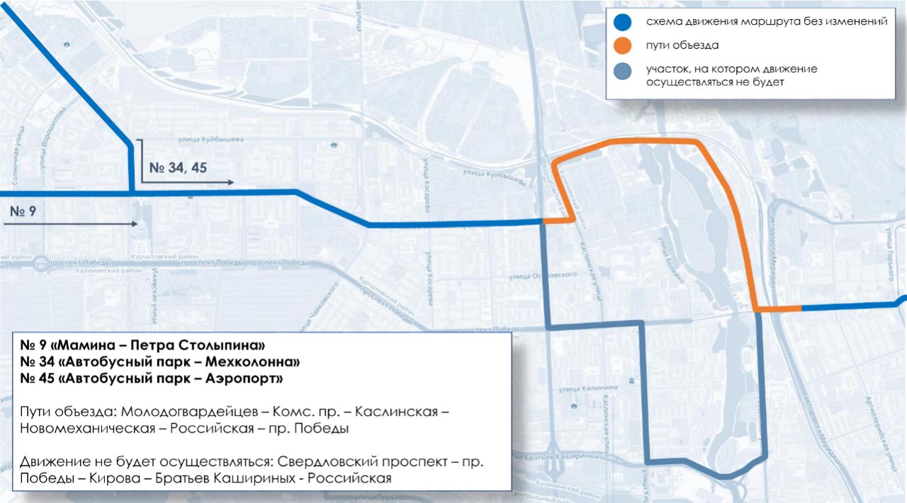 Автобусы № 9, 34 и 45 поедут через объезд по маршруту: Молодогвардейцев — Комсомольский проспект — Каслинская — Новомеханическая — Российская — проспект Победы.