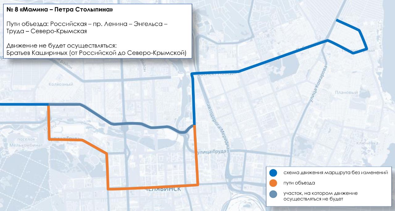 Автобус № 8 не будет проезжать по улице Братьев Кашириных на участке от Российской до Северо-Крымской. Транспорт будет идти по маршруту: Российская — Ленина — Энгельса — Труда — Северо-Крымская.