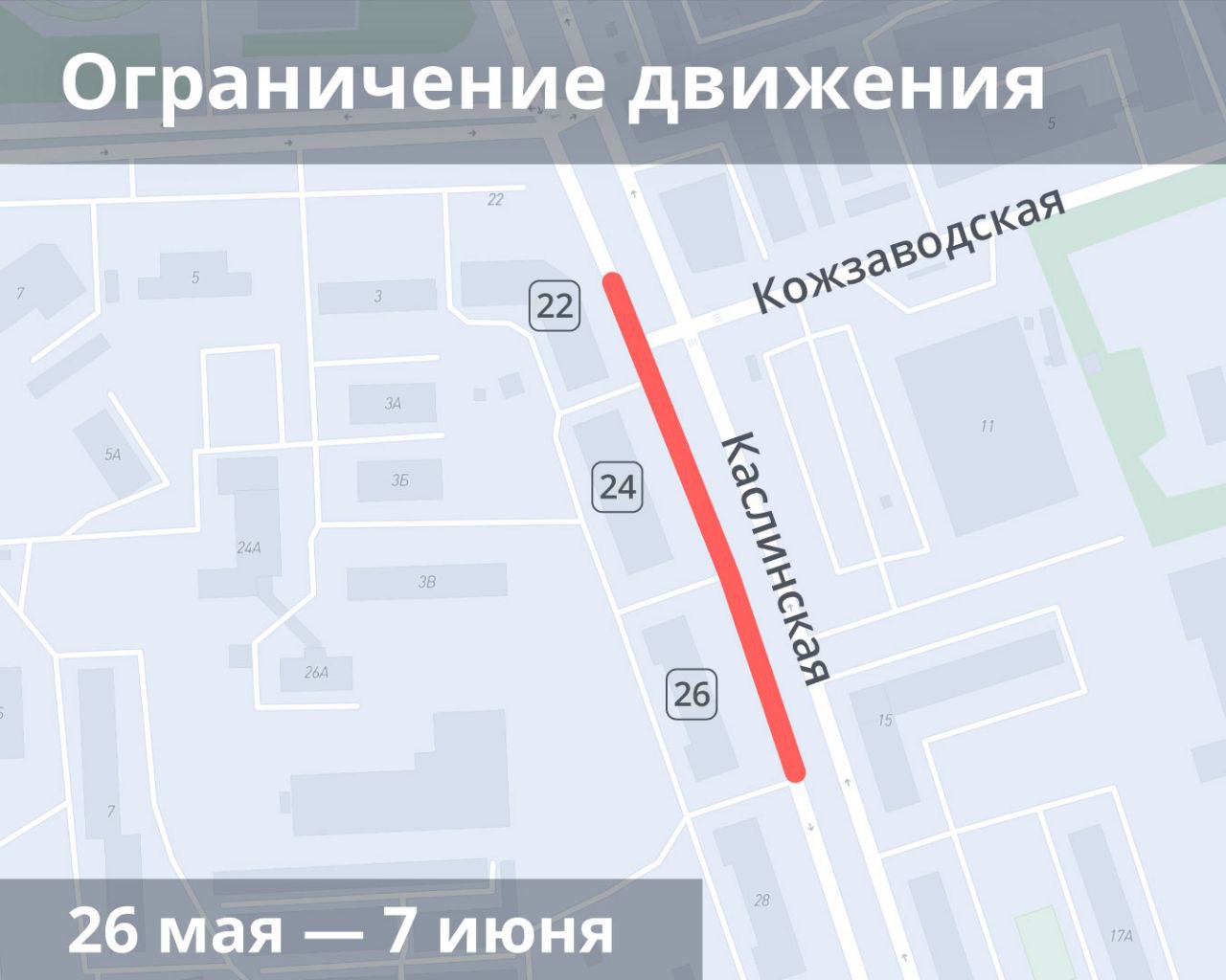 Дорогу перекроют на участке между домами 22 и 26, неподалеку от пересечения улиц Каслинской и Кожзаводской. Водителей просят учитывать ограничения и заранее планировать свой маршрут.