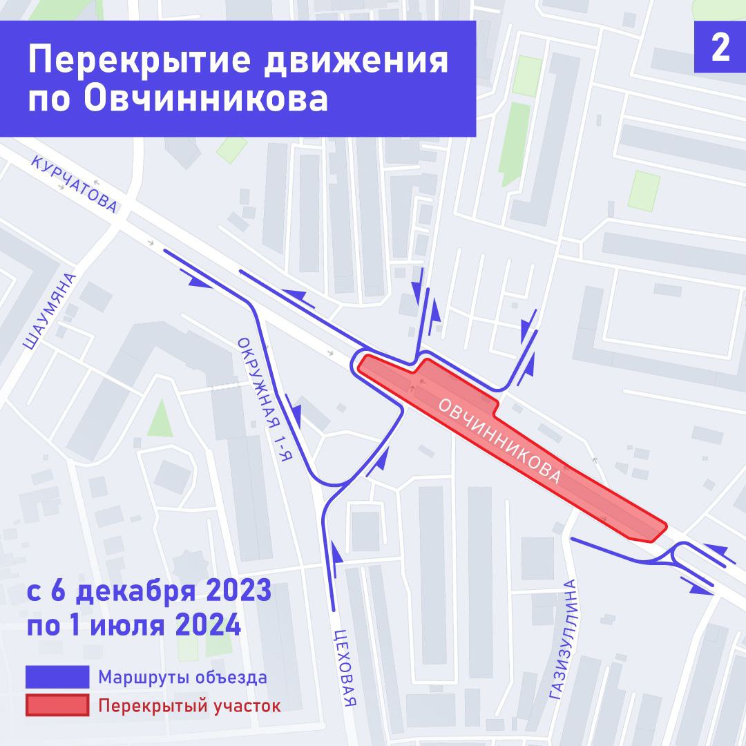 Более чем на полгода для автомобилистов и общественного транспорта закроют участок улицы Овчинникова от Окружной-1 до улицы Замятина. Автобус № 33 будет следовать в объезд по улицам Курчатова — Цеховая — Доватора. До 1 июля подрядчик будет переустраивать сети городских коммуникаций и подготавливать площадку для строительства.