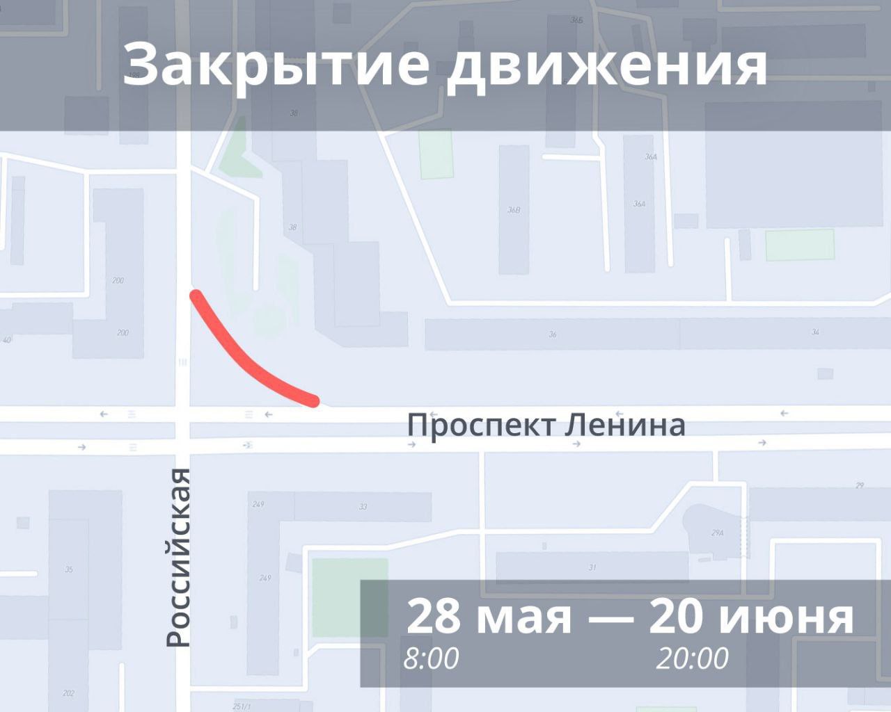 «В связи с проведением работ на сетях водоснабжения с 28 мая до 20 июня будет закрыт правый отнесенный поворот с проспекта Ленина на улицу Российскую»,— уточнили в мэрии.