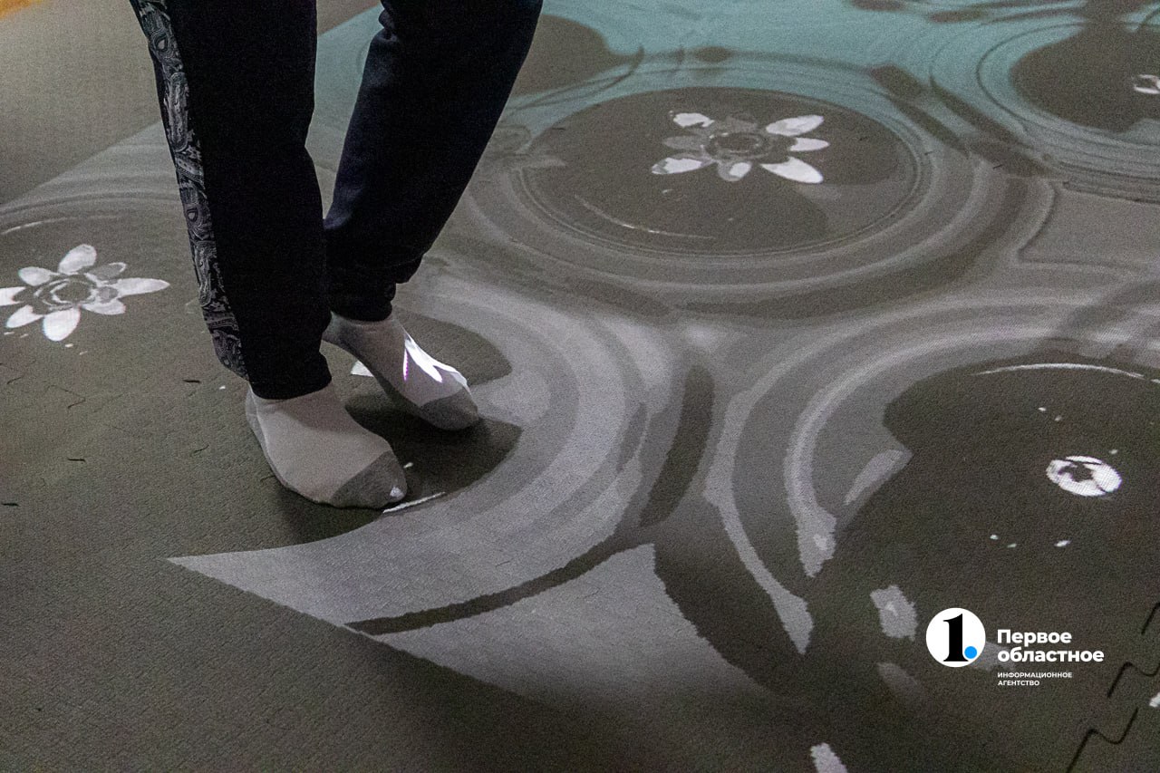 В этом же зале еще одна пациентка работает на интерактивном ковре — тренирует внимание и координацию.