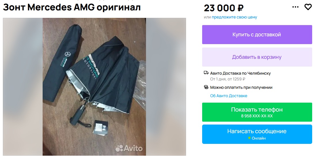 В объявлении челябинец сообщает, что вещь оригинальная и была приобретена в Сочи в 2020 году на выступлениях гонок «Формула 1». Снаружи зонт черный, внутри — серебристого цвета. В описании также указано, что зонт новый с этикеткой.