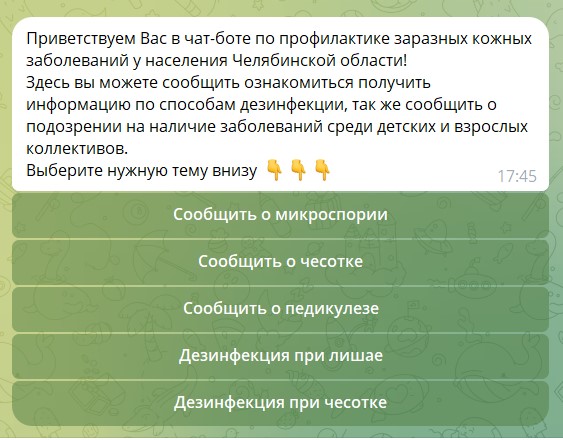 Также чат-бот предоставляет полезные памятки и рекомендации по профилактике микроспории, чесотки и других кожных заболеваний. И сообщает правила дезинфекции в очагах заболеваний.