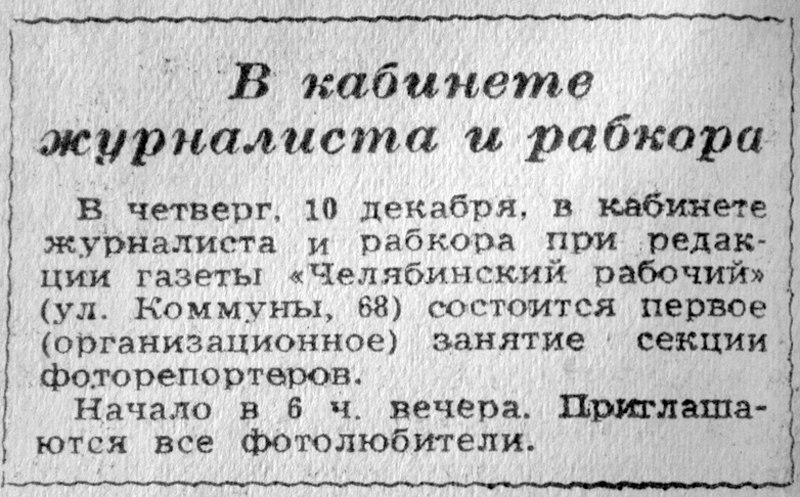 В Челябинске существует и динамично развивается старейшее в стране объединение фотолюбителей. Почти 65 лет назад официально появился на свет Челябинский фотоклуб (ЧФК). 9 декабря 1959 года на последней странице областной газеты «Челябинский рабочий» было опубликовано небольшое объявление о первой организационной встрече секции фоторепортеров. На встречу приглашались все желающие фотолюбители, местом встречи назначили один из кабинетов журналистов в редакции «Челябинского рабочего».
